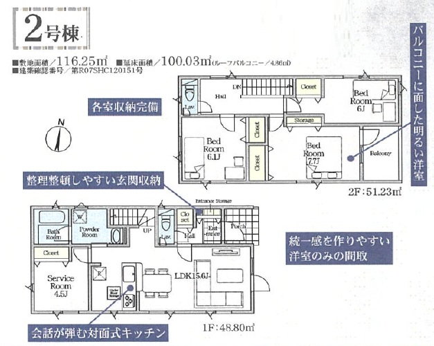 「住宅性能評価取得 (耐震等級3=最高等級) (断熱等性能等級5=ZEH基準相当)」「駐車2台可」「ZEH Oriented」「対面キッチン」「エコジョーズ」「フラット35S(ZEH)」「スマートキー」「防犯カメラ」「耐震+制震装置で繰返しの地震に強い」「奥行の有るワイドバルコニー」